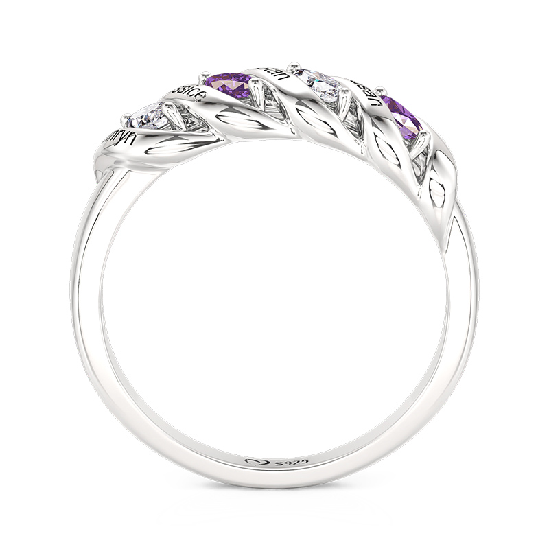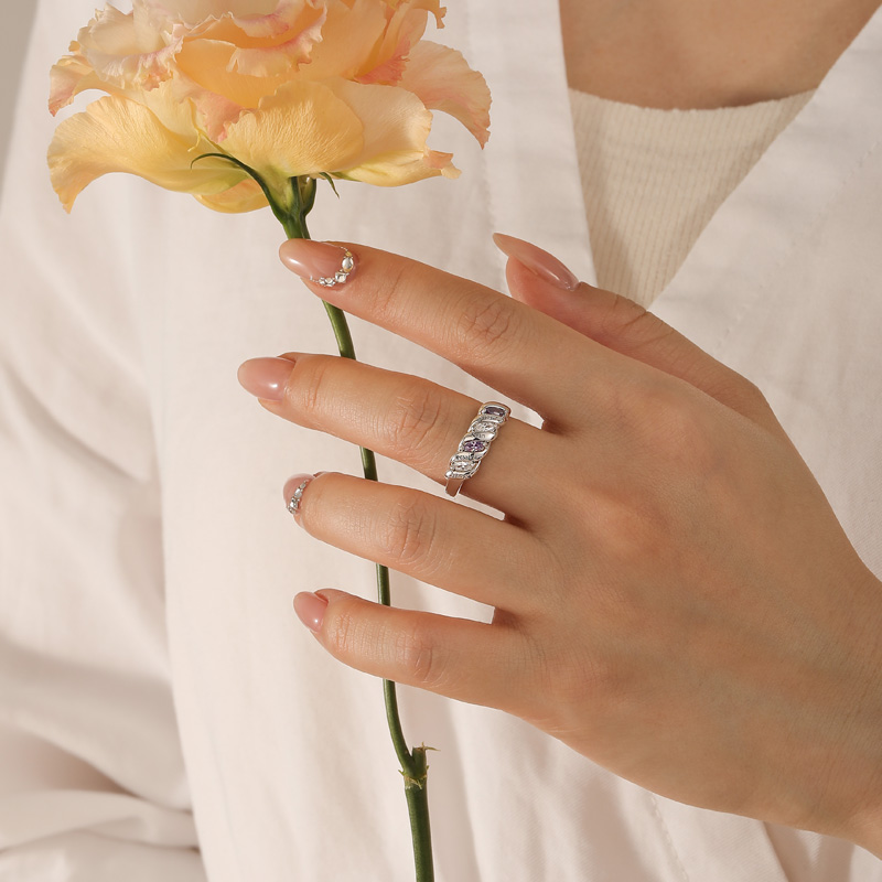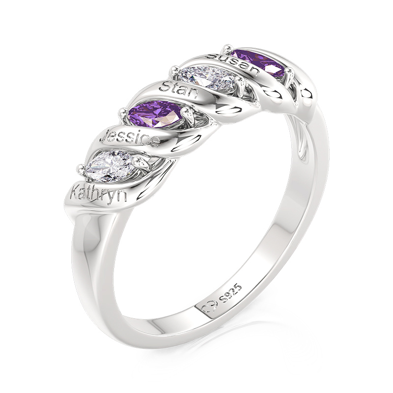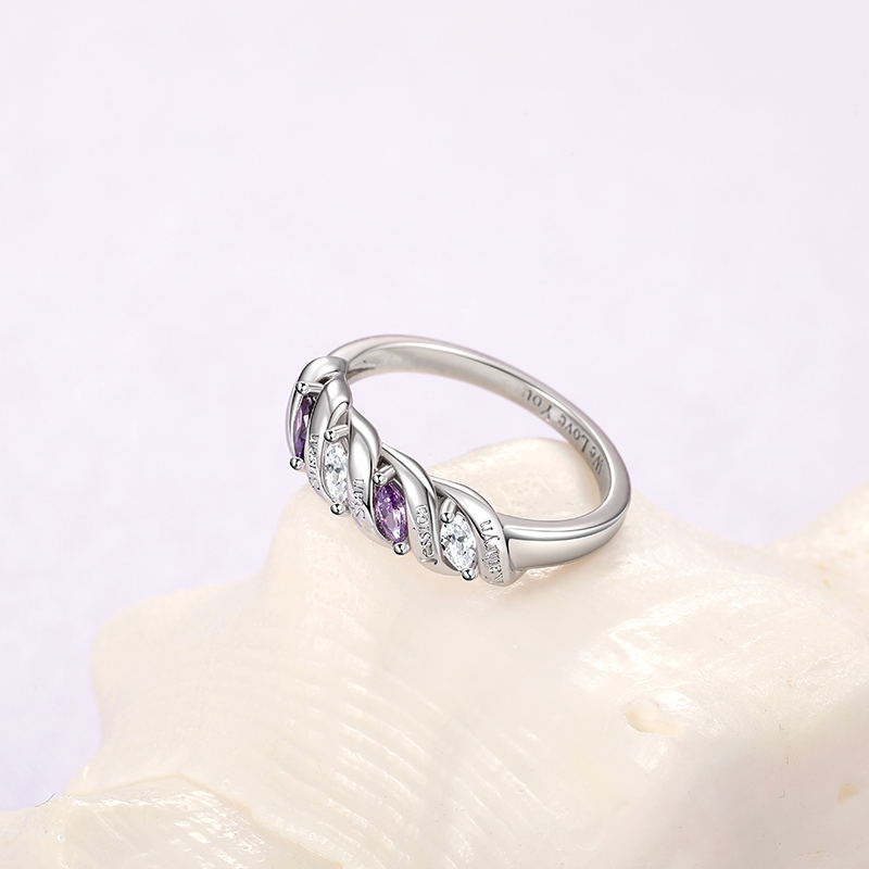 A unique and personalized piece of customized jewelry, this spiral marquise row women wedding ring is a perfect illustration of the emotions of love and preciousness. Featuring an elegant wave design, the engraved women's band is set with several sparkling gemstones, and you are free to choose the color of the stones to match your personal style or special meaning. The name of your loved one can be engraved next to each stone. Whether as a birthday gift, an anniversary surprise, or a symbol of deep affection, this birthstone ring conveys your unending love for a loved one or a dear friend, and is a timeless piece to treasure.